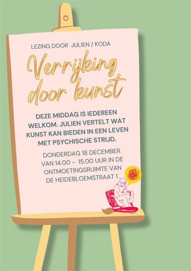 Op donderdag 18 december organiseert Art-tics een lezing over kunst en psychische kwetsbaarheid: Verrijking door kunst. Kunstenaar Julien vertelt deze middag over verschillende kunstenaars uit de kunstgeschiedenis voor wie psychische worsteling een rol speelde in hun leven en werk. Ook gaat hij in op wat kunst kan bieden wanneer je zelf met een psychische kwetsbaarheid te maken hebt.